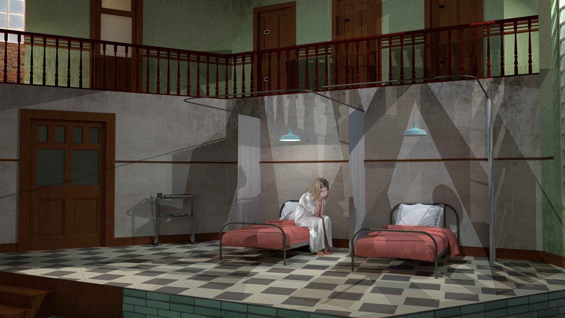The lower level serves as the communal ward; checkered flooring, wooden tables and simple metal-framed beds curtained for privacy, reinforcing the sense of control and exposure. The tiled bath area at the front edge of the stage hints at cleansing rituals and echoes Blanche’s obsession with purity and escape whilst the upper gallery, lined with closed wooden doors, creates a looming sense of surveillance, a reminder of unseen authority and memory.