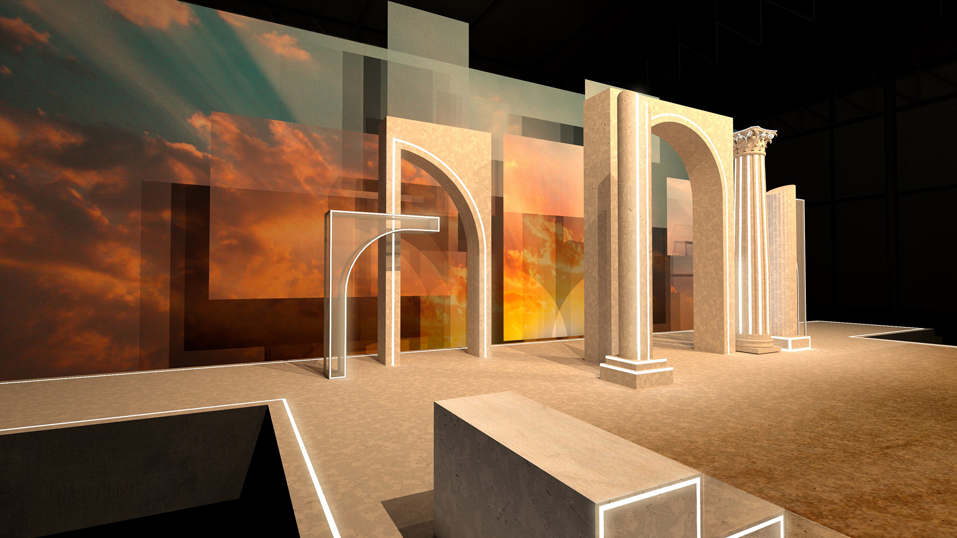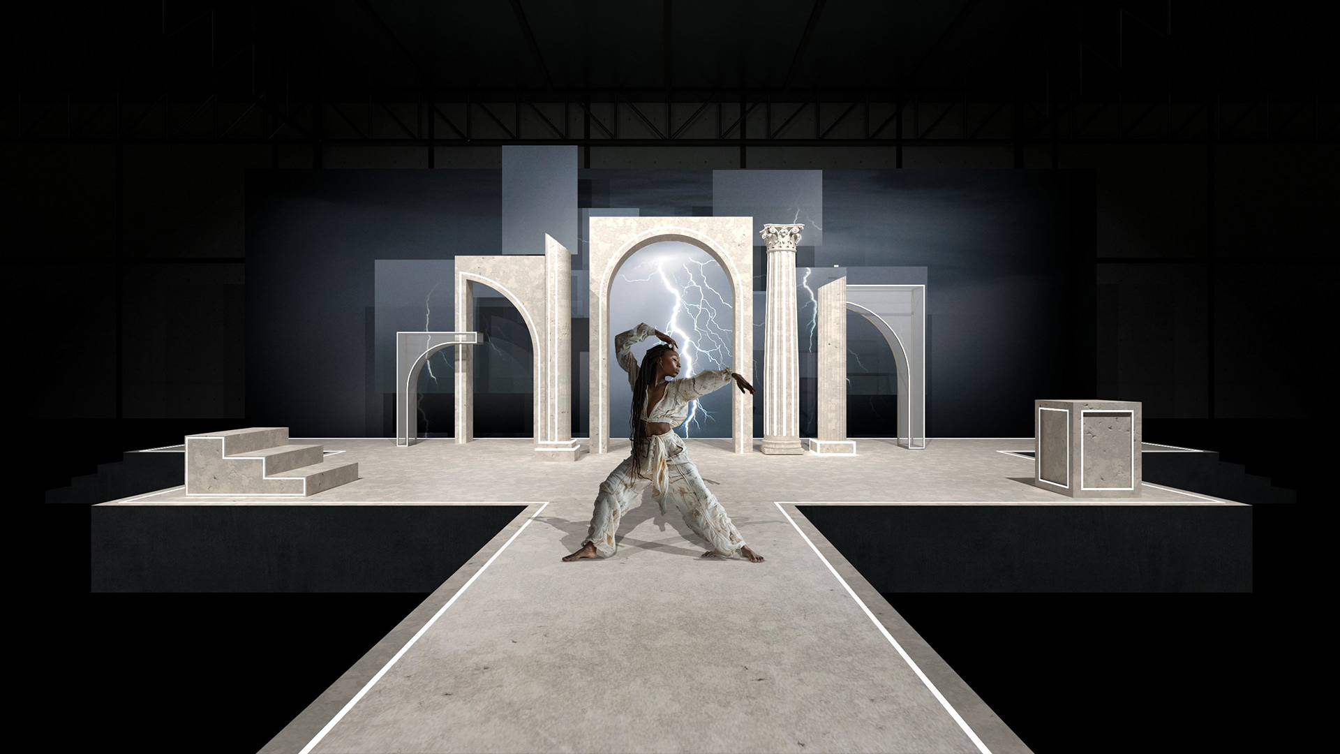 The set includes a main stage and two satelite stages which further speak to the themes of a fractured soul it incorporates versatile and transformative elements that reflect the journey of rising above adversity. The fractured architectural elements reminiscent of city ruins symbolise the obstacles faced by the performers and are used to drive the narrative.