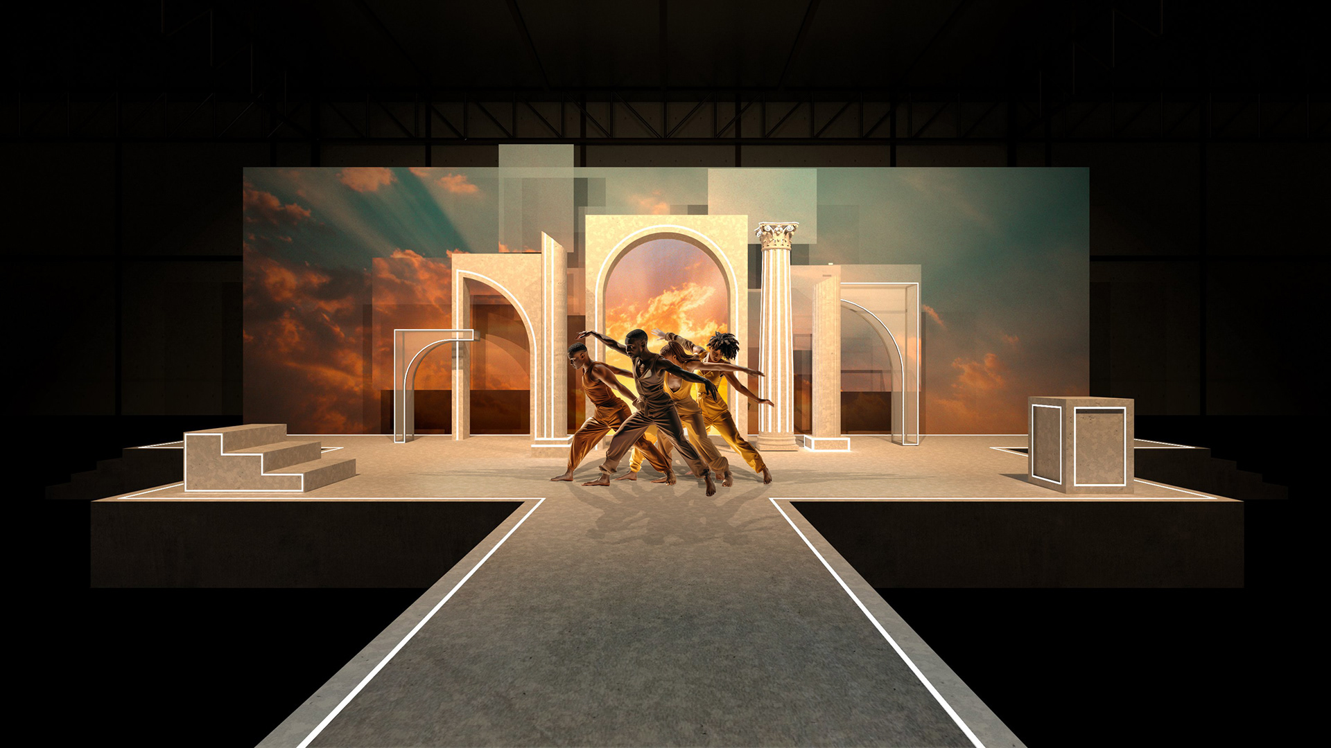 The set design aims to encapsulate the transformative journey depicted in the poem, transitioning from darkness and oppression to illumination and empowerment. Through a combination of dynamic set elements, lighting, and projection, the stage becomes a canvas for the dancers to embody the themes of resilience, liberation, and triumph over adversity. Lighting and projection play a key role in the design with an animated backdrop of a thunderous storm and dim, cool light creating a sense of foreboding and oppression in the first half juxtaposed with the slow comforting progression of the sunrise and warm golden hues flooding the stage evoking a feeling of hope and renewal.