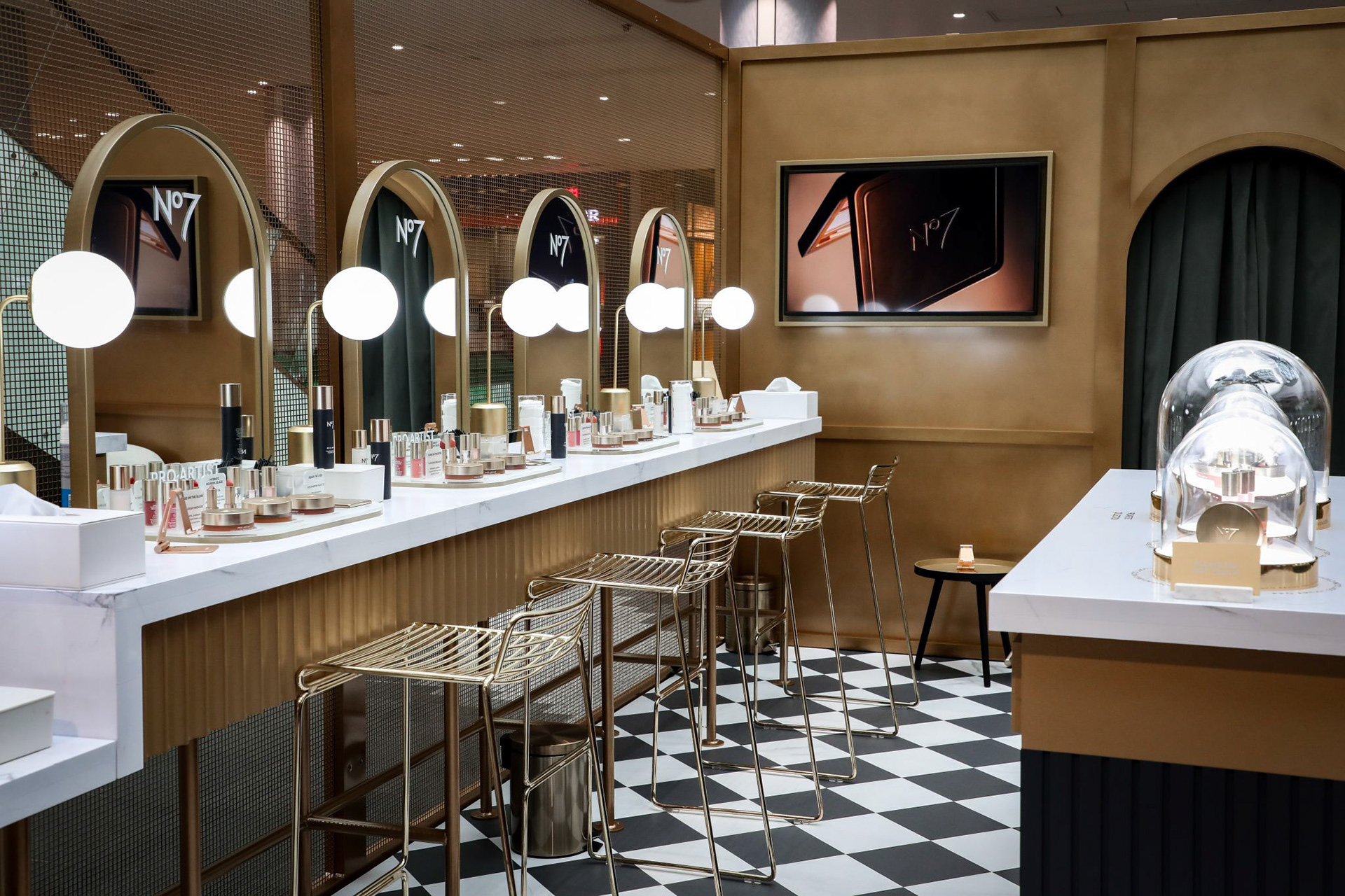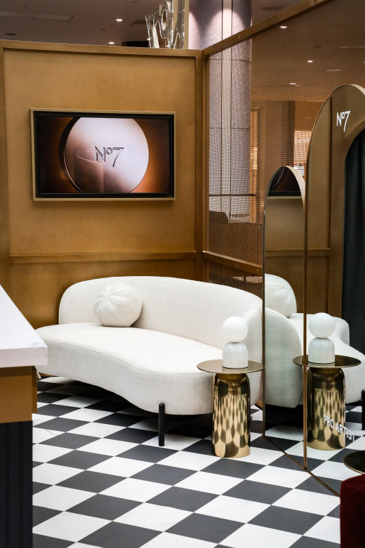 The challenge was to excite and inspire new and existing consumers that No7 is a destination for incredible, luxurious, yet affordable make-up. The aim was for people to leave their perceptions of No7 cosmetics behind and experience the standout quality of the Pro Artist range experiencing the products completely blind. It was important for the design to immerse customers in a luxurious, premium environment that felt both elegant and aspirational reinforcing the message that No7 offers premium quality products. The space needed to exude sophistication, invite participation, interaction and encourage guests to engage directly with the products in a way that enhanced the sense of exclusivity. This immersive experience should not only showcase the premium quality of the brand but also drive customers to seek out the No7 range for themselves in store.
